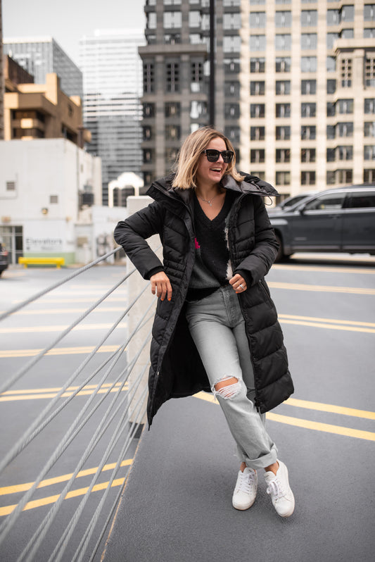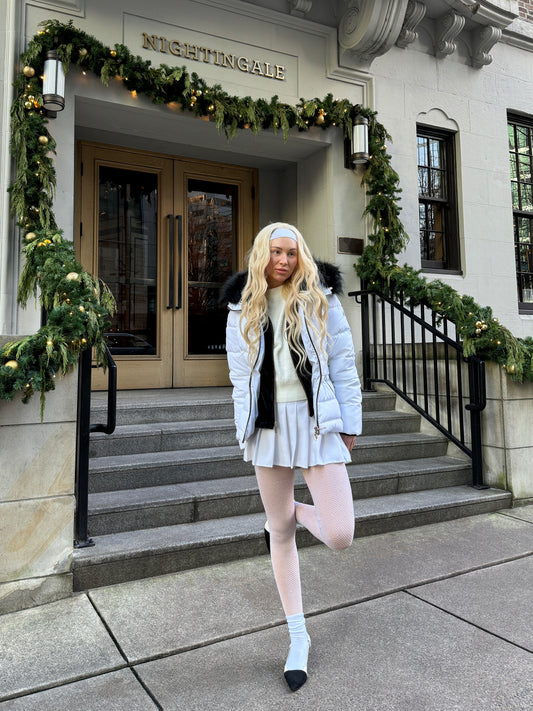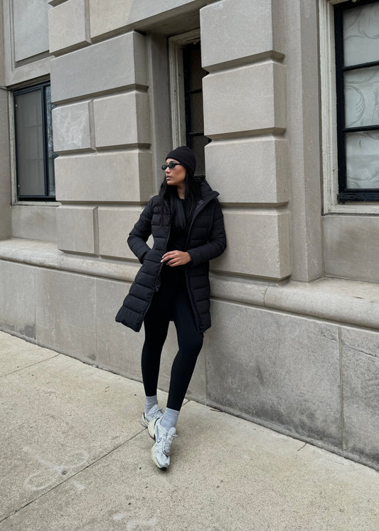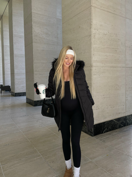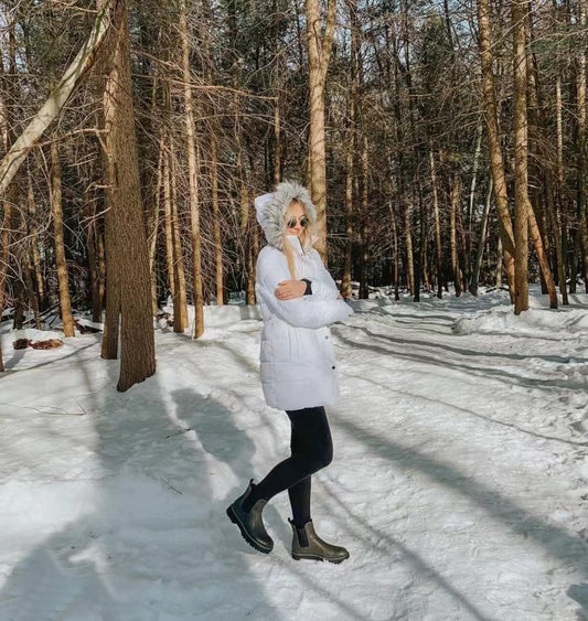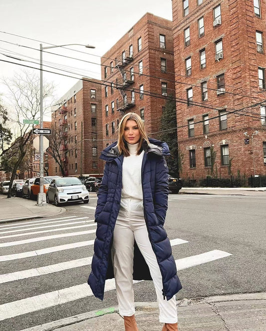 Anonymous This is a beautiful looking coat, I love the fur trim on the hood! And it is very warm with the length being long enough to cover but still flattering. My only downside is that as it is not down it is heavier puffier, taking up more space. I love the white color as it makes it easier to see me in the dark when walking my dog in the evenings. It also arrived faster than anticipated.